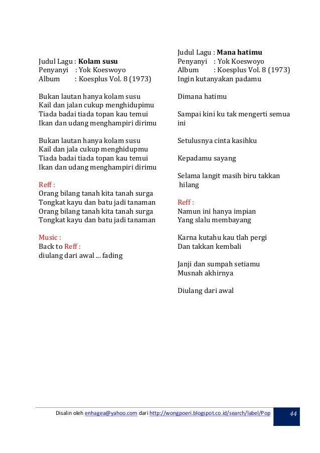 Lirik lagu kolam susu dari koes plus. Lirik lagu koes plus kolam susu oleh torik kotul aosat. Lirik lagu kolam susu dari koes plus. Lihat lirik lagu oleh. Lirik lagu yon koeswoyo kolam susu jakarta banyak hal yang terungkap soal yon koeswoyo setelah tutup usia pada jumat 5 1 2018.